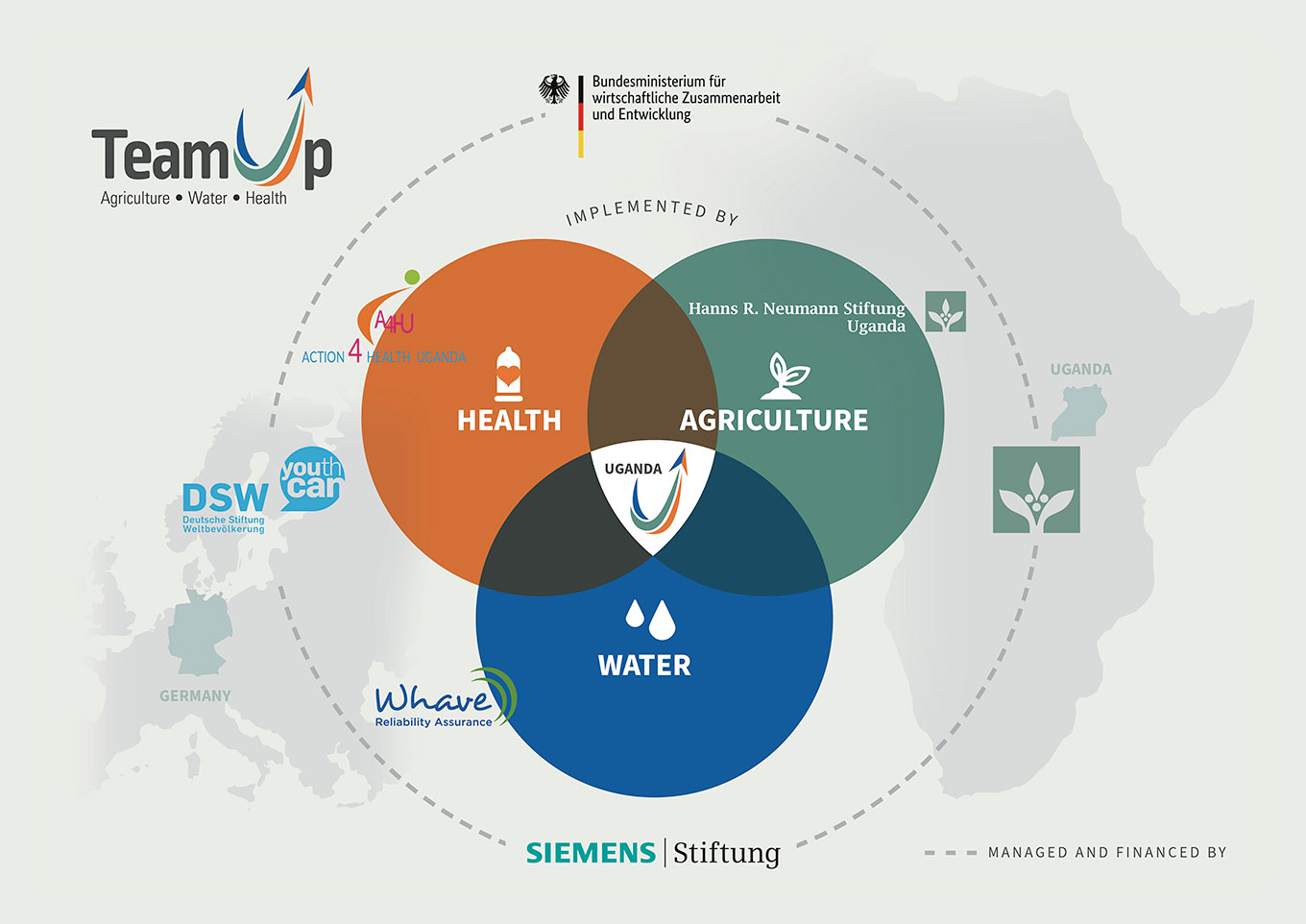 TeamUp is a new multi sectoral approach to development cooperation initiated by the German Federal Ministry for Economic Cooperation and Development (BMZ) and managed as well as co-financed through the three foundations Deutsche StiftungWeltbevölkerung (DSW), Hanns R. Neumann Stiftung (HRNS) and Siemens Stiftung.